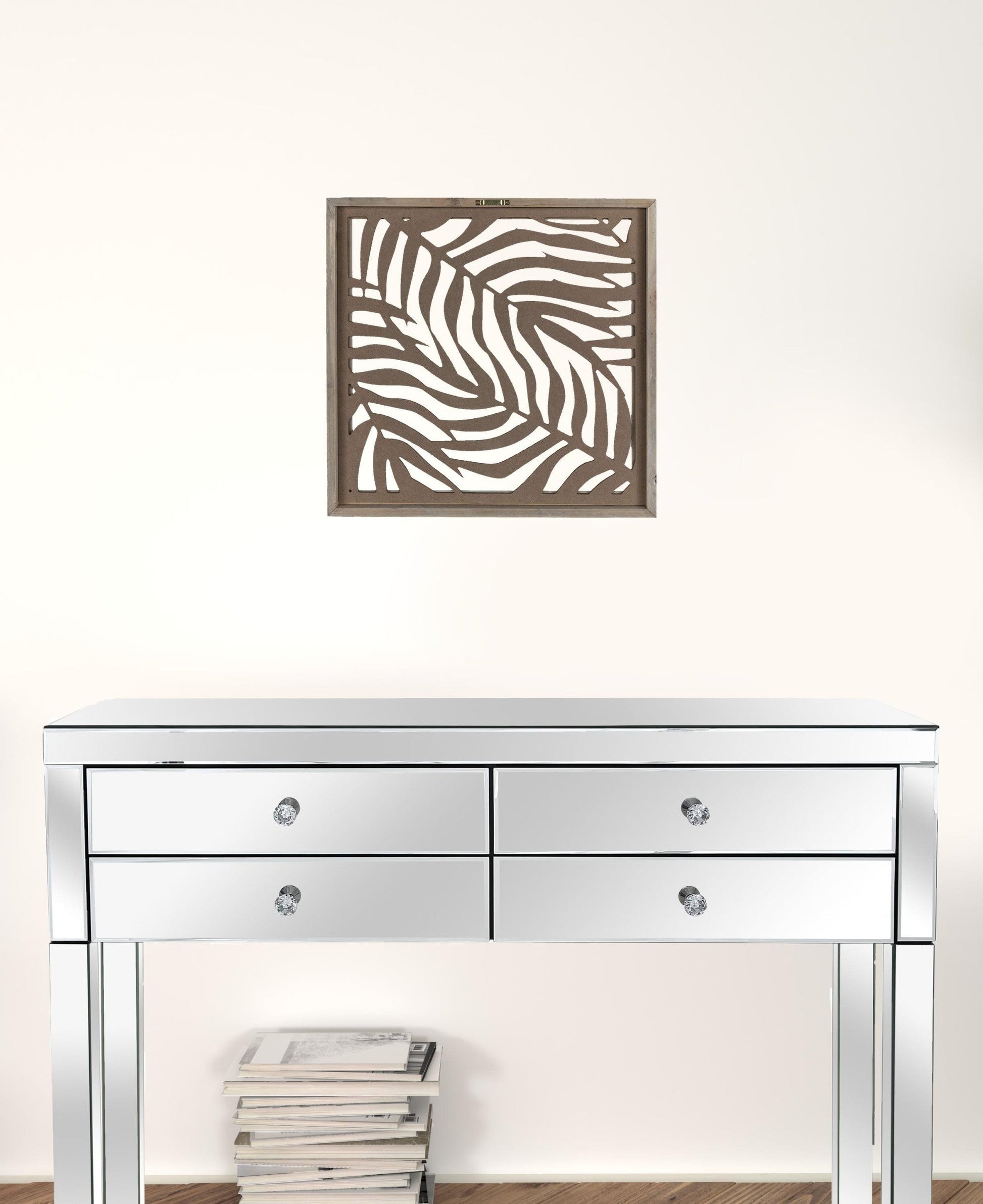 Stay connected to nature with a hint of tropical with this contemporary view of a wooden palm wall art. This abstract yet natural version of a laser cut palm leaf will be an imporessive piece of art to showcase in your modern home setting. A distressed white frame also complements the natural design and coloration of the palm piece itself. Made of 60% MDF and 40% wood, this piece measures 16" W x 1" D x 16" H.