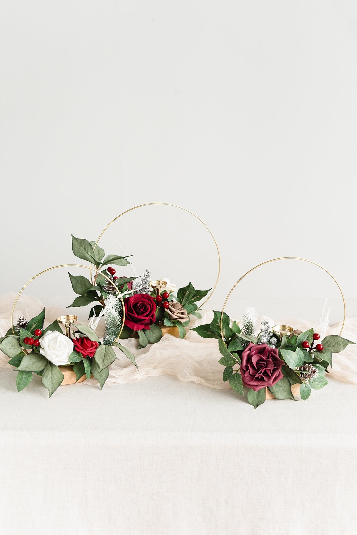 - Material: The holders are made of high-quality gold ring candle holders and wooden bases. The flower arrangements are made of real-looking gold-tipped rose, petite rose, chorale rose, Vendela rose, berries, pine leaf & picks.