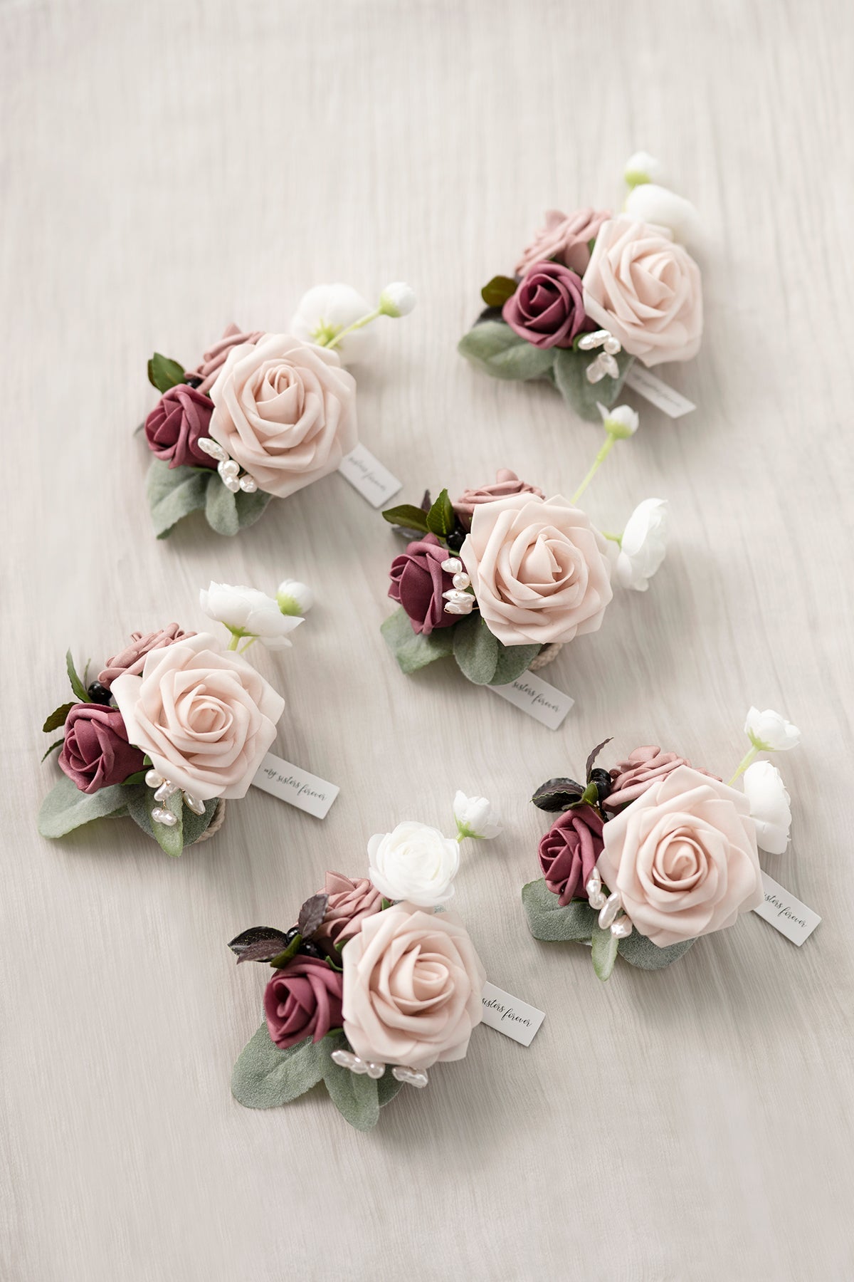- Material: The elegant wrist corsages are made up of artificial dusty rose foam rose, mauve foam rosebud, ivory silk ranunculus, and dusty rose foam rose, accented with pearls, blueberry, Elm leaves, and flocked silver dollar eucalyptus. The corsage wristlet is filled with dusty rose, mauve, and ivory details!