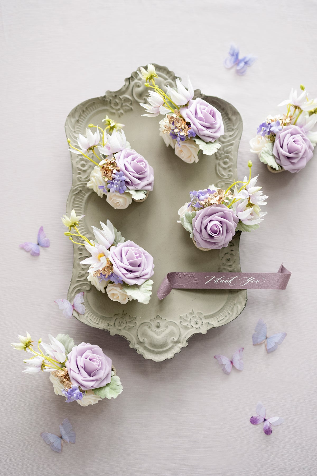 - Material: The luxurious wrist corsages are made of artificial Lavender Vendela rose, ivory and cream petite rose, Blushing bride flower, and lavender Hydrangea accented with Willow Dusty Miller, golden leaves.