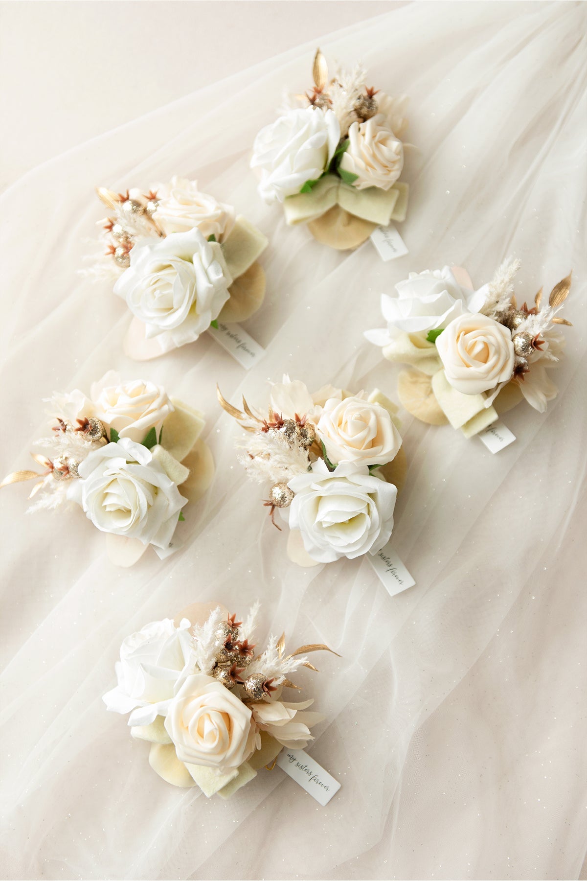 - Material: The luxurious wrist corsages are made of artificial cream rose, cream petite rose, and nude color galsang flower, accented with blush eucalyptus, and white astilbe Chinensis.